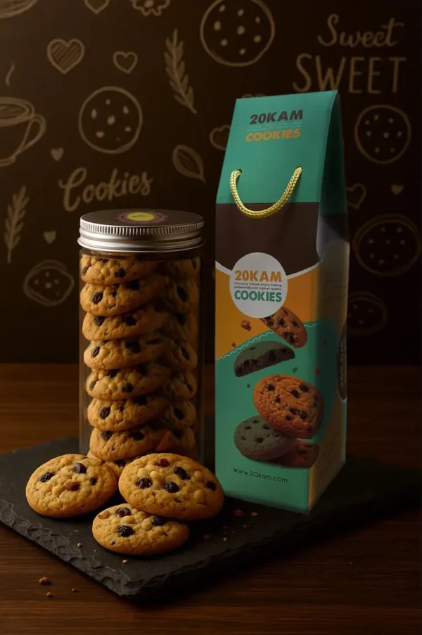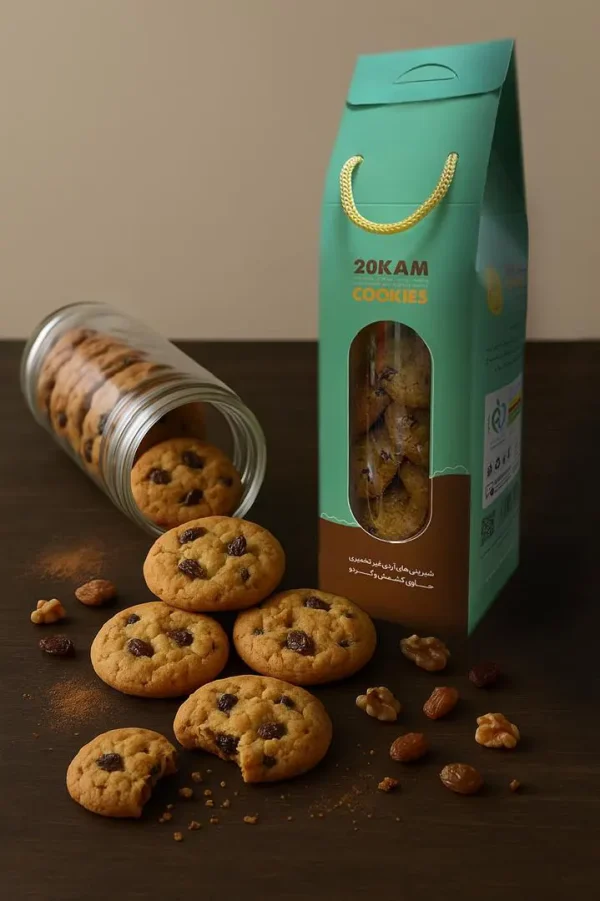 ترکیبات: آرد گندم (نول)، شکر، روغن قنادی و آردی، کشمش، گردو، روغن مایع آفتابگردان، بکینگ پودر، پودر وانیل، پودر کاکائو، آب